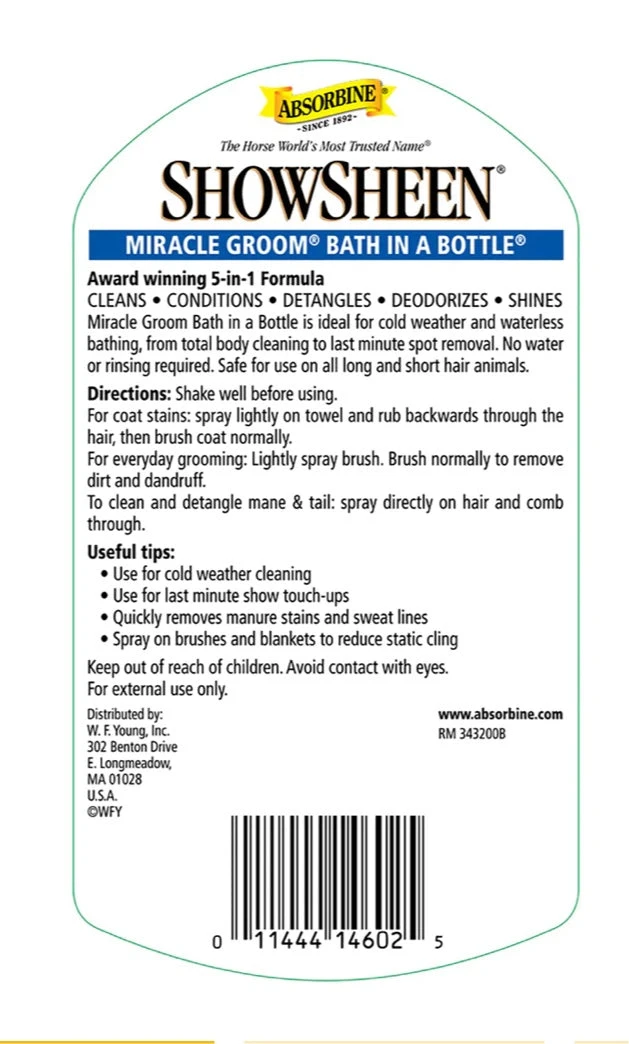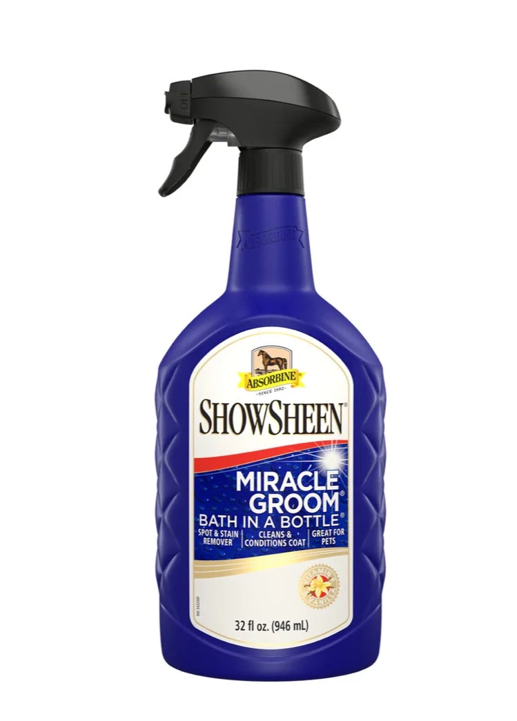 ShowSheen® Miracle Groom® “Bath In A Bottle®” features a 5-in-1 formula that cleans, conditions, deodorizes, detangles, and shines—no rinsing or extra water needed. Our waterless animal shampoo comes in a ready-to-use spray that works without soap or water, so it’s great when you need to thoroughly clean your horse in cold weather or climates where water is scarce.