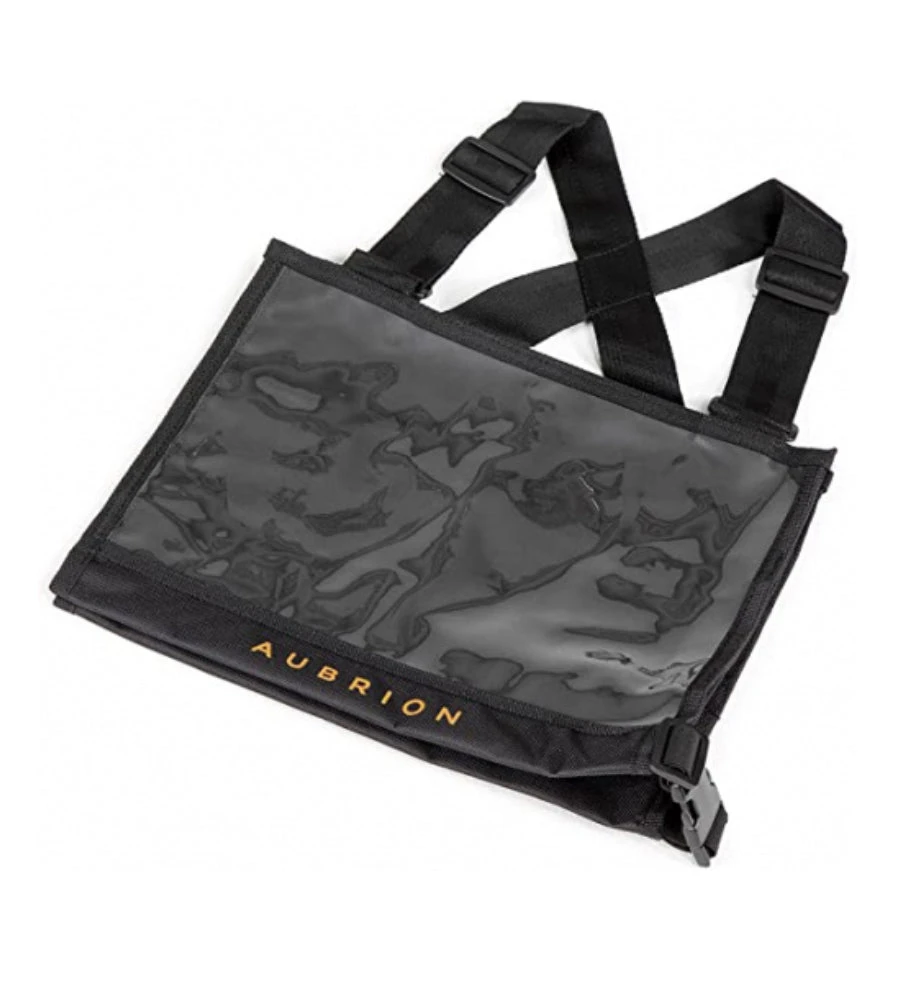 This practical and comfortable number bib features a clear plastic front and back plus adjustable shoulder and side straps. Aubrion logo written across bottom.