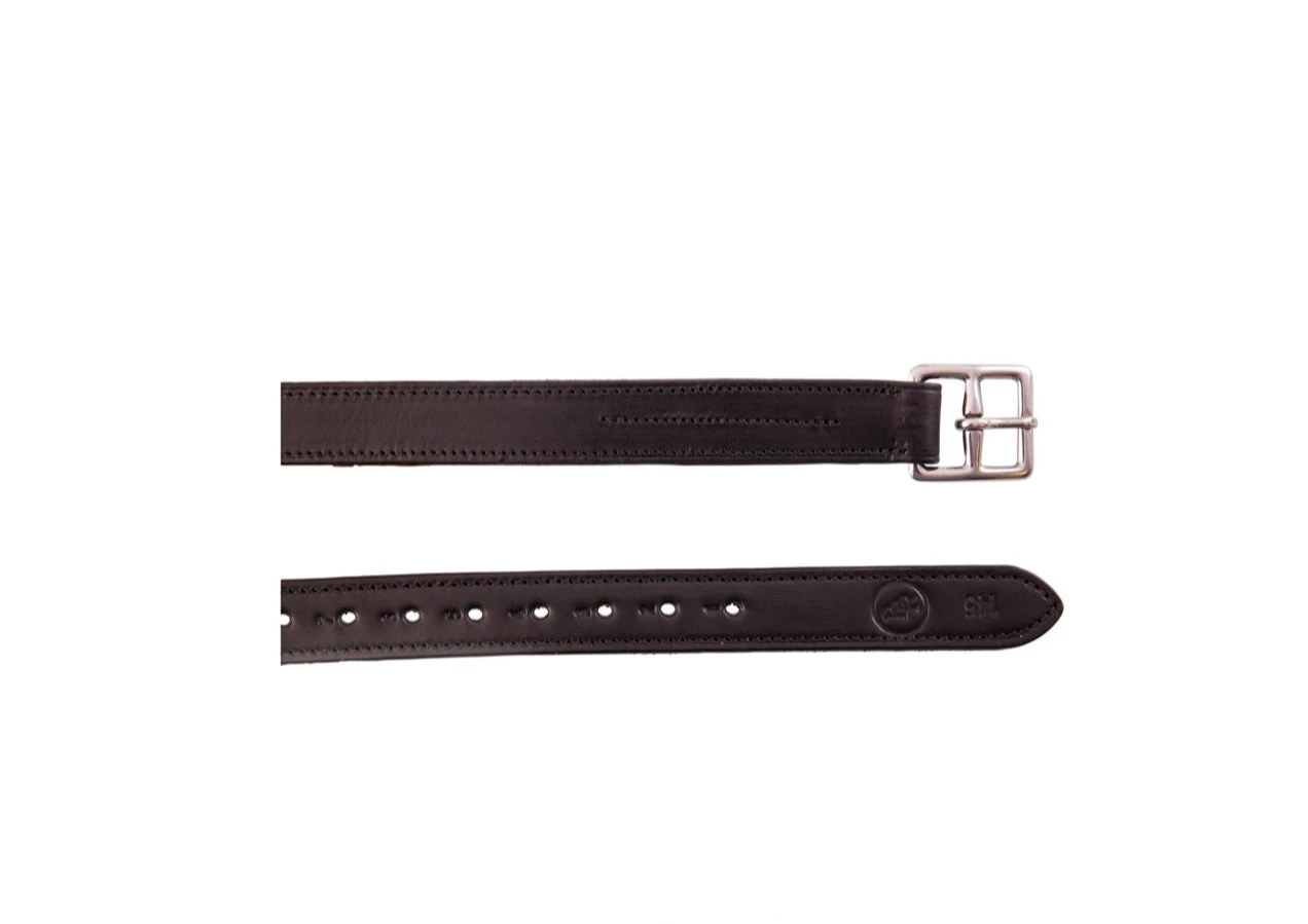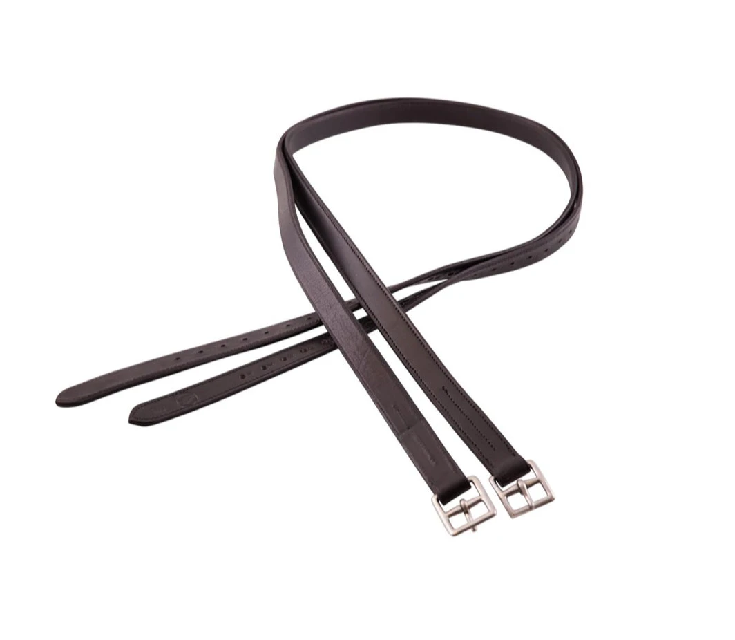 Strong, yet supple stirrup leathers made of full-grain leather, reinforced with a full nylon core and lined with soft calf leather. With fine, slightly curved stainless steel buckles. 1” width.