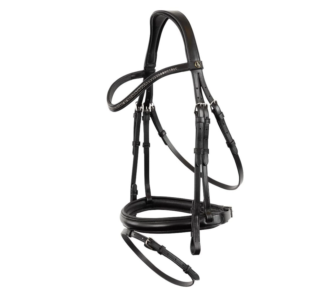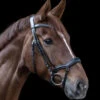 The beautiful slightly curved browband with black, shiny Stellux™ imitation diamonds gives the bridle an elegant look. The bridle fits nicely on the horse’s head thanks to the supple leather. In addition, the bridle contains sturdy buckles with chrome finish and a flash strap with protective flap for the buckle.