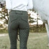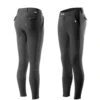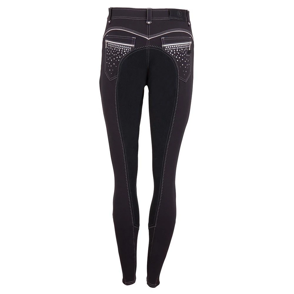 These close fit ladies’ riding breeches have a ¾ microfiber seat. The riding breeches feature two jeans pockets and an additional coin pocket at the front and two zipper pockets with YKK zippers at the back. The jeans pockets and the yoke have been trimmed with stretch contrast piping. The glitter print at the back pockets gives a trendy look. The stretch waistband features belt loops with rivets. The elastic lower leg inserts ensure optimal comfort in the riding boots. Material: 68% polyester, 22% cotton, 10% elastane.