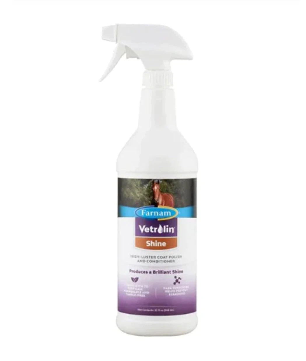 Vetrolin Shine instantly adds a long-lasting, healthy sheen to any coat. Vitamin-rich conditioners keep mane and tails tangle-free. PABA sunscreen protects skin and hair.