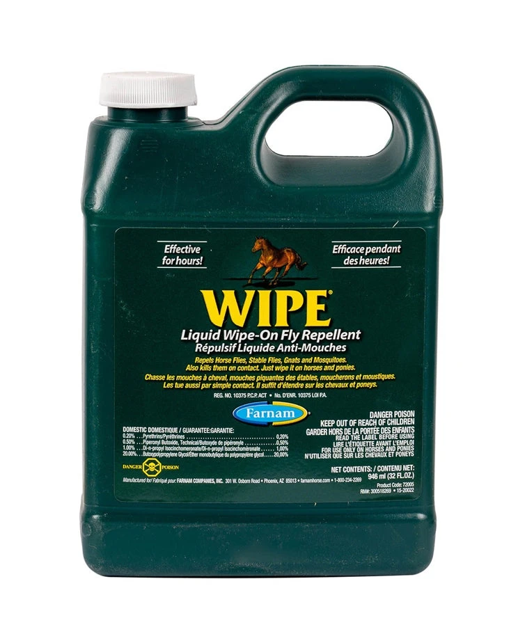 Wipe® Fly Protectant Powerful formula helps repel horse flies, house flies, stable flies, deer flies, gnats and mosquitoes for a full 24 hours. Easy to apply with a brush applicator, sponge, cloth, or spray bottle (all sold separately). Helps in the removal of dirt and dandruff and adds shine to the coat.