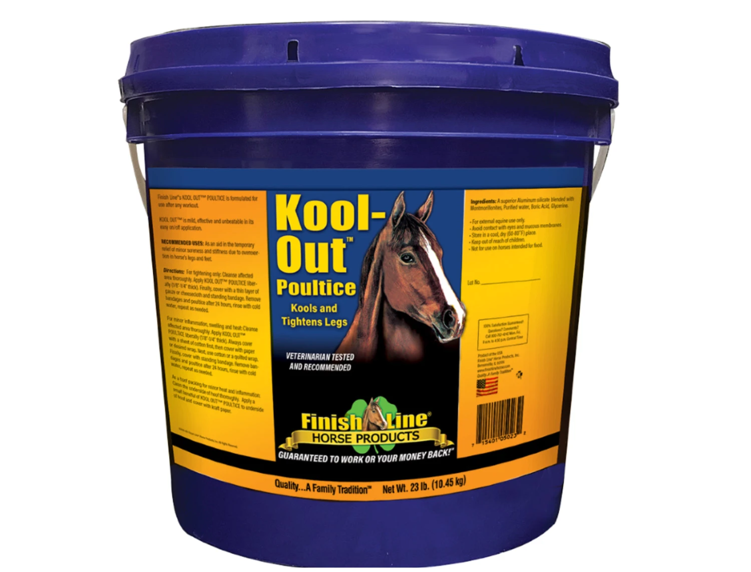 Kool-Outā¢Ā Poultice is an aid in the temporary relief of minor stiffness and soreness due to overexertion. Equine skin is 8ā10 times more sensitive than human skin; Kool-Outā¢Ā was formulated especially for sensitive horses.Ā Kool-Outā¢Ā non-medicated poultice is creamy and smooth, it goes on easy and washes off easy. Finish LineĀ®ās Kool-Outā¢Ā Poultice is mild enough for everyday use and for horses with sensitive skin, can be used over minor nicks and cuts. It cools and tightens your horseās legs after workouts, performances, events, and races. Also used as a hoof packing.