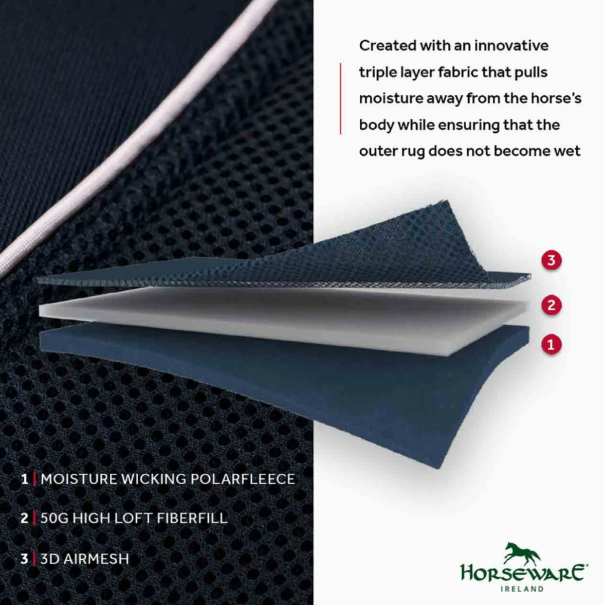 The top layer consists of a 3D air mesh for aeration. The 3D air mesh creates extra airspace of warmth & further evaporation, preventing your outer rug from becoming damp or the horse feeling cold.