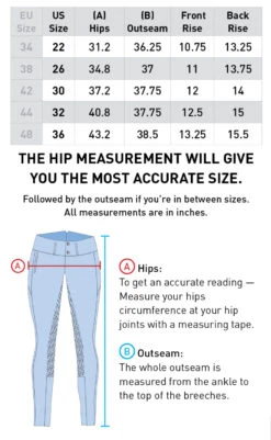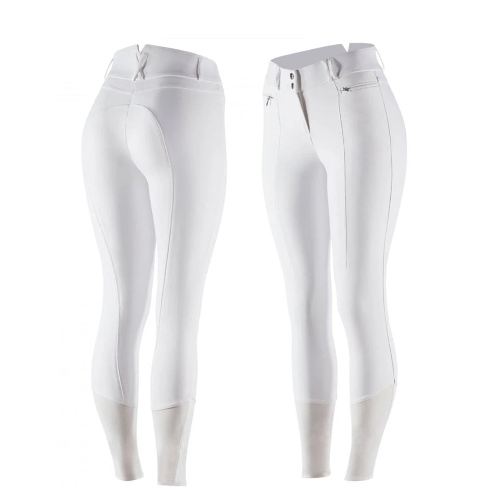 The Horze Women’s Angelina Full Seat Breeches with Silicone Grip are lightweight full seat breeches that are the perfect choice for hot summer days. These riding pants are designed with seams at the front for a slimming effect. A silicone print full seat provides extra grip and security in the saddle. The high waist helps you maintain your correct position with ease. Additional details include convenient front zipper pockets, along with a front zipper and snaps. The Angelina Full Seat Breeches by Horze are made from breathable and quick dry fabric to keep you cool and dry. The mesh fabric at the leg is also breathable to help you stay comfortable under your boots.