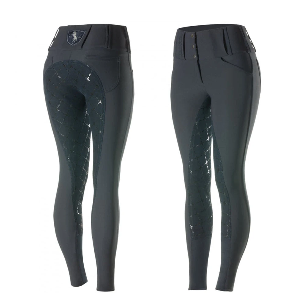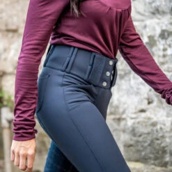 The Horze Women’s Desiree Full Seat Breeches are stunning riding pants designed with a vertically stretchable Alos leather full seat that includes a cool silicone pattern for style and functionality helping you to stick like glue to the saddle. The breathable fabric retains its shape while repelling dirt and water so you always look your best. The extra high waist with wide belt loops is a favorite among dressage riders and will support you while holding your in your stomach. The flattering Desiree breeches include UV protection (UPF 50+). Further features are front and back pockets, wide belt loops, a front zipper, as well as a stylish back logo.