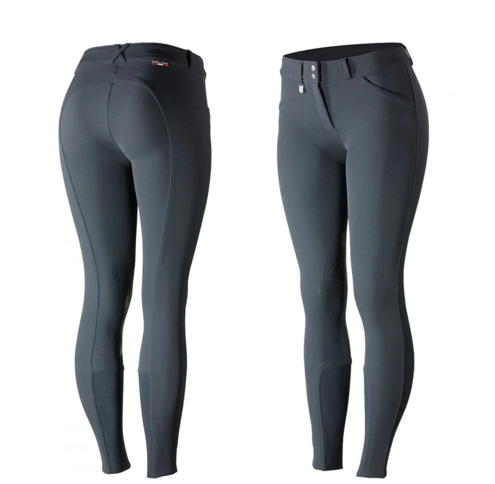 The Horze Women’s Grand Prix Knee Patch Breeches with Silicone Patches are Horze’s most popular, classic breeches that have been improved to offer even more benefits to riders of all disciplines and abilities. Approved by top professional athletes, these breeches are both traditional and formal. A contrasting knee patch silicone grip gives practical purpose to these sharp looking simple breeches. Slant front pockets, a wide waistband, and a smooth back are nice touches. You will look crisp and clean all day in this classic cut. The timeless Women’s Grand Prix Knee Patch Breeches, by Horze, now have a new silicone surprise at the knee. In addition, the water and dirt repellent fabric includes UV protection (UPF 50+).