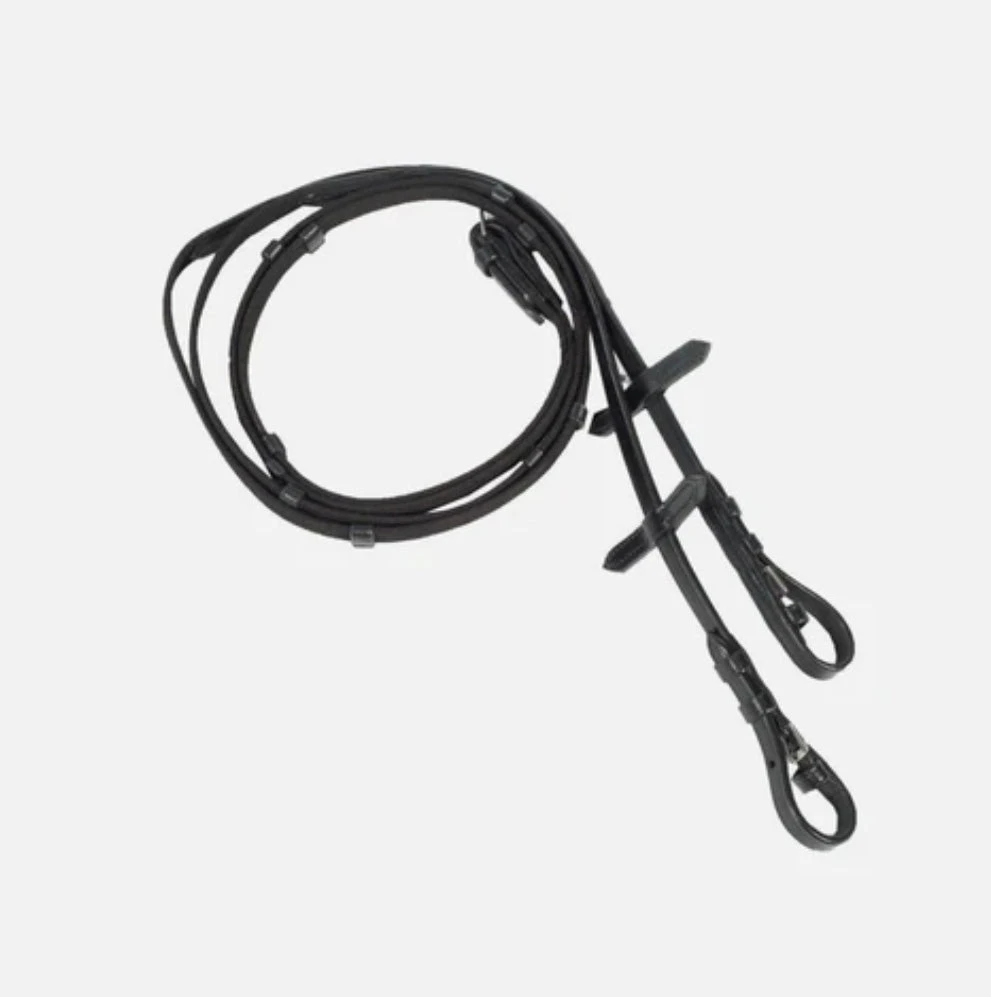 These reins feature a web style rein with hand stops and is intertwined with rubber for additional grip. This allows for a more flexible feel and less bulk than traditional rubber reins, while still having the improved traction in wet conditions. Features stainless steel buckle ends for easy changing of bits and attached leather bit stops.