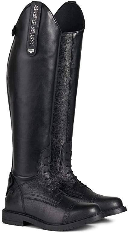 Our Verona Tall boots are both elegant and practical – perfect for competitions where you need to look and perform your best. Both detachable trims feature a small, silver pin with the Horze logo. Smooth synthetic leather on the outer leg, and an embossed area of leather on the inner leg combine to create highly professional tall boots. The elastic panel that runs the length of the boot shaft ensures a glove-like fit. The foot has punched details, fixed elastic laces and a handy spur rest. A leather strap with snap buttons at the top and bottom of the zipper keeps this boot securely fastened.Â