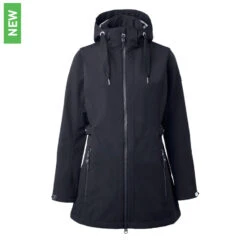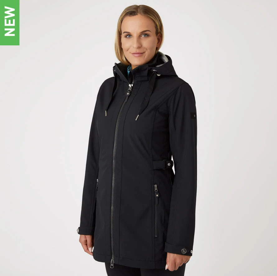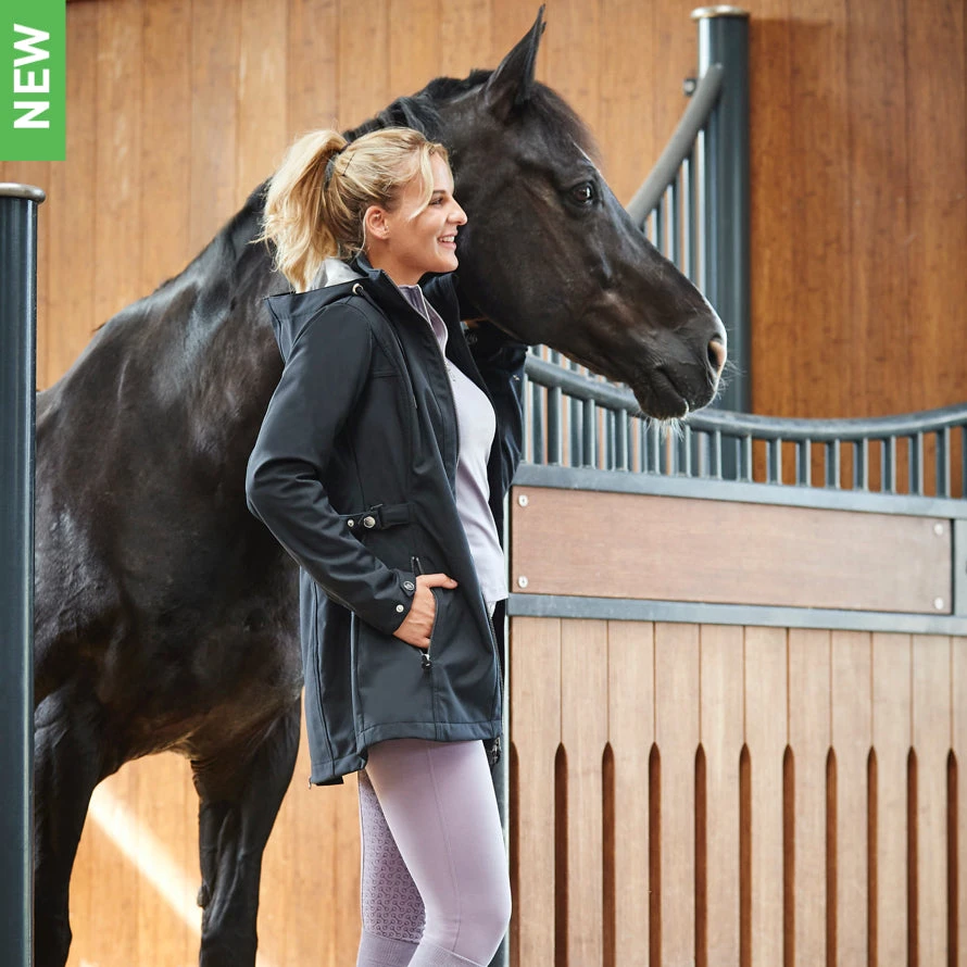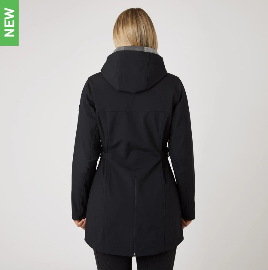 Soft fleece lining makes this comfortable, long, soft-shell jacket a great choice. Add this extra layer of warmth with flattering styling to your wardrobe and always have the perfect jacket to wear riding in cooler weather. The waterproof, breathable shell comfortably keeps water out. A vented back allows you to cover the saddle without interfering with your ride. Adjust the waist with straps and press buttons to give a custom fit. The side pockets and two-way zipper finish the clean look. 3000mm waterproof, 1000mvp breathable, no taped seams.