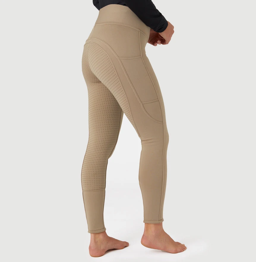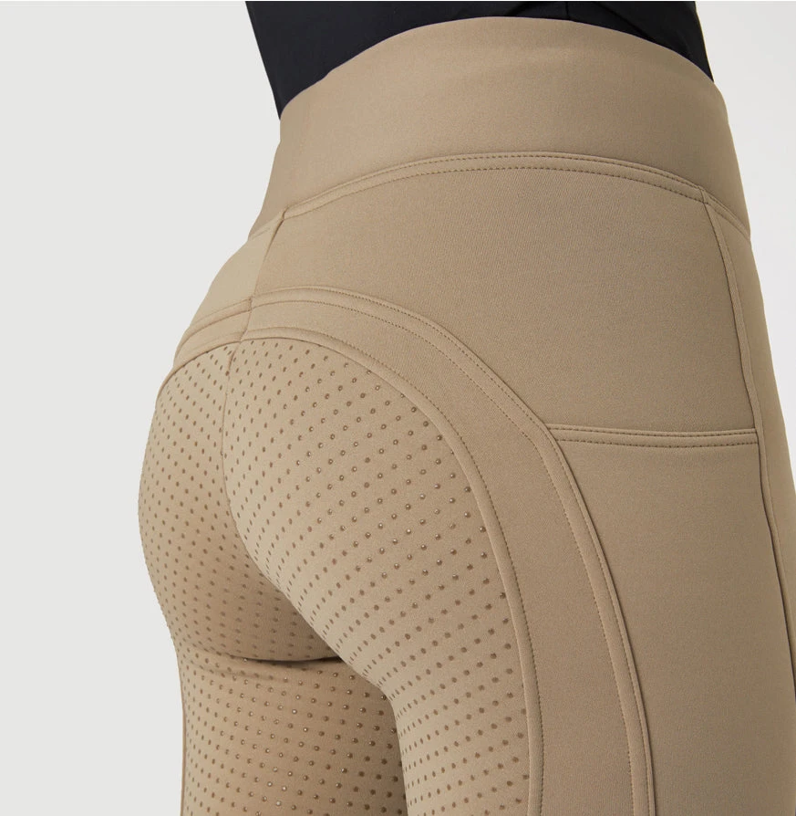 The soft, breathable fabric with brushed fleece lining is ideal for holding warmth in to keep you feeling cozy even on cold weather rides. The mid-rise waist is perfect for layering and the simple front closure won’t feel binding in the barn or in the saddle. For added security, the silicone full seat adds a little extra grip to keep you secure in the saddle on those days when your horse is feeling a little frisky.