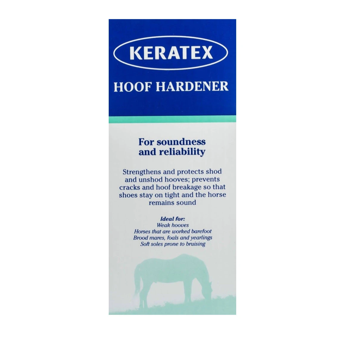 Keratex Hoof Hardener will strengthen and protect shod and unshod hooves, to restore soundness after sensitive soles and to prevent existing cracks from laddering up or across the hooves.