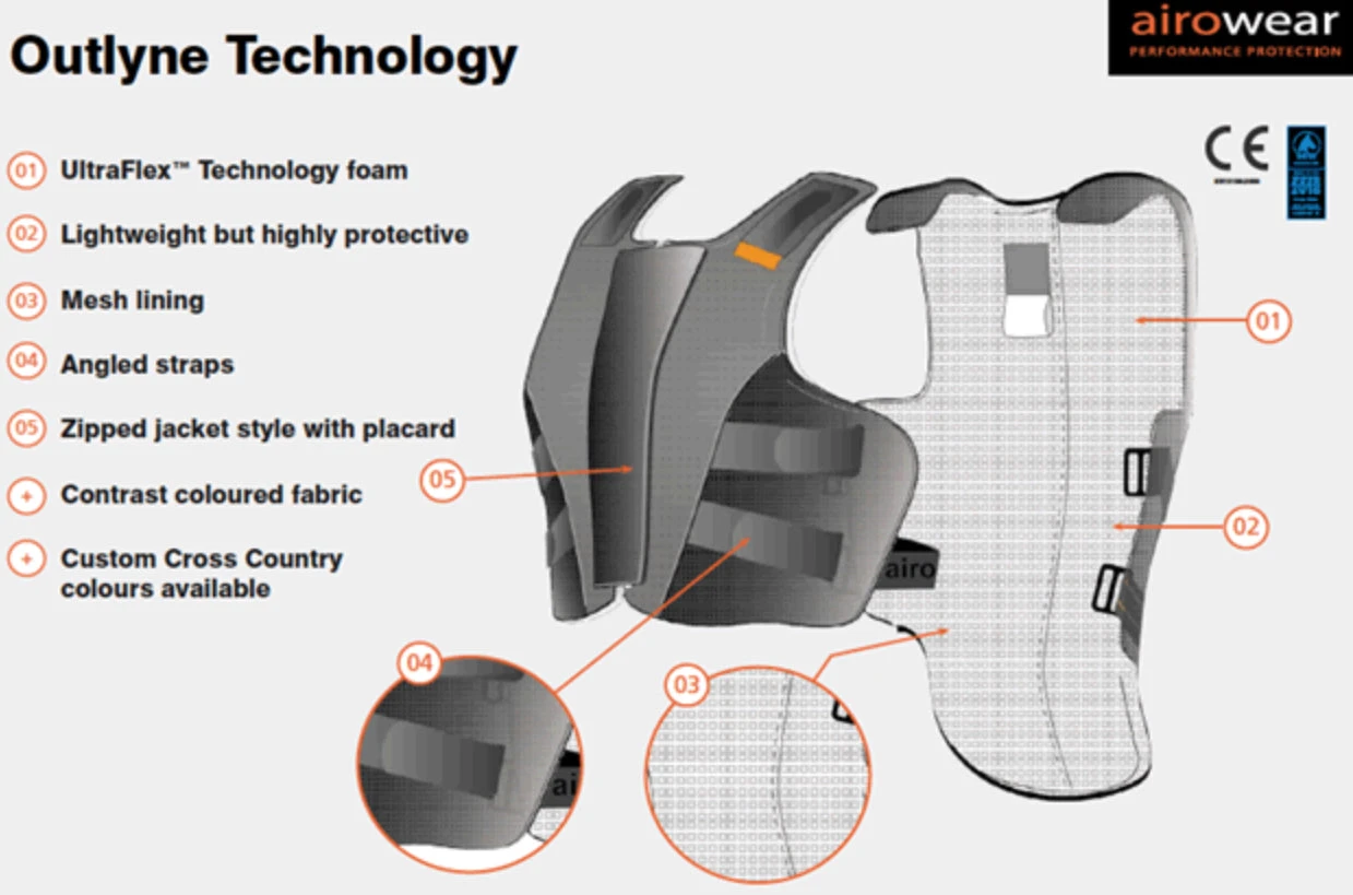 The Outlyne body protector is styled with a zip-front and uses UltraFlex technology to be flexible to the riders shape giving you maximum protection and unrestricted movement with a perfect fit and flexibility. The Outline body protector offers the maximum level of protection by fully meeting EN13158.2009 and BETA 2009 Standard level 3. Airowear were the first and second to conform to BETA’s current safety standard. Outlyne is annually retested to give you peace of mind that the body protectors are consistently meeting the latest safety standards