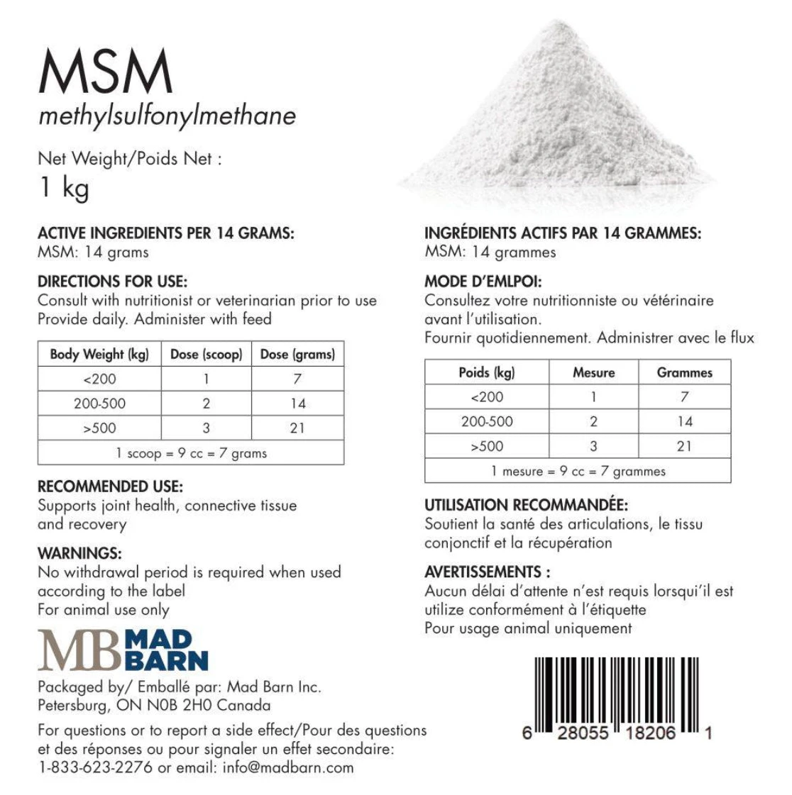 MSM is an equine supplement used to promote joint comfort, healthy connective tissue and recovery from exercise. It has been shown to relieve arthritic pain and sore muscles, protect against oxidative stress and support healthy skin, coats and hooves in horses.