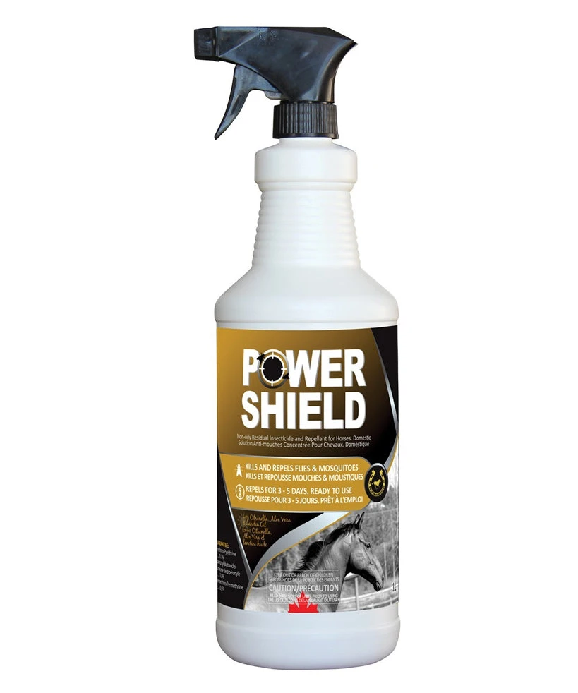 A long lasting, non-oily residual insecticide and repellent that contains 0.33% pyrethrin, 0.77% piperonyl butoxide and 0.5% permethrin and features the natural properties of citronella, aloe vera and lanolin oil. Golden Horseshoe Power Shield Spray’s New formula is stronger and can now kill ticks in addition to kill horn flies, house flies, mosquitoes, horse flies, deer flies (tabanids) and stable flies and can last up to 3 to 5 days with one application. Proudly Canadian!