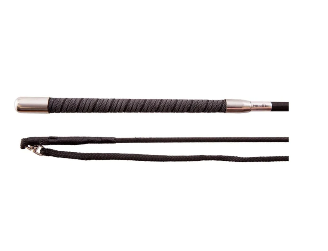 Two-piece lunging whip with screw-cap. Fibreglass, nylon thread stem, with non-skid grip and nylon lash.