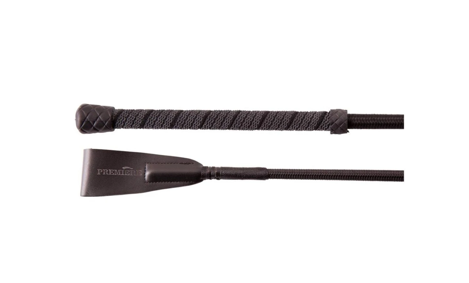 Fine jumping whip from Premiere. This jumping whip is made of polycarbonate. The whip has a nylon fought anti-slip handle. With open leather flap.