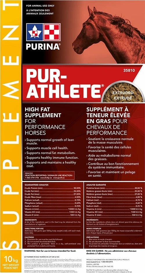 An extruded high fat supplement derived from vegetable & flaxseed (source of Omega 3) and contains blood building nutrients (copper, cobalt, folic acid, Vitamin B12). In addition to improving skin, hair coat, hoof condition and muscle mass, research demonstrates that fat spares muscle glycogen. Pur-Athlete as a controlled NSC (sugars and starch) level of 17% max