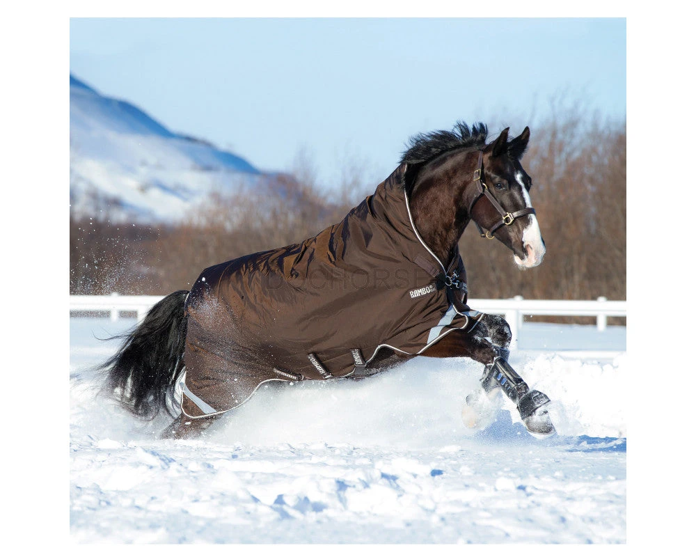 The Rambo Wug with Vari-Layer is designed to give more warmth with less weight and has a high Wug style neck – specifically designed for narrow horses with high withers. Cut from the strongest and most durable turnout material on the market – Ballistic nylon, this rug is waterproof and highly breathable. Features of this rug include high cut neck to give a snug fit and elimenate wither pressure, V-Front closure to give freedom of movement to graze, leg arches, reflective strips, wipe clean tail cord, three secure cross surcingles, and shine ehancing polyester lining.