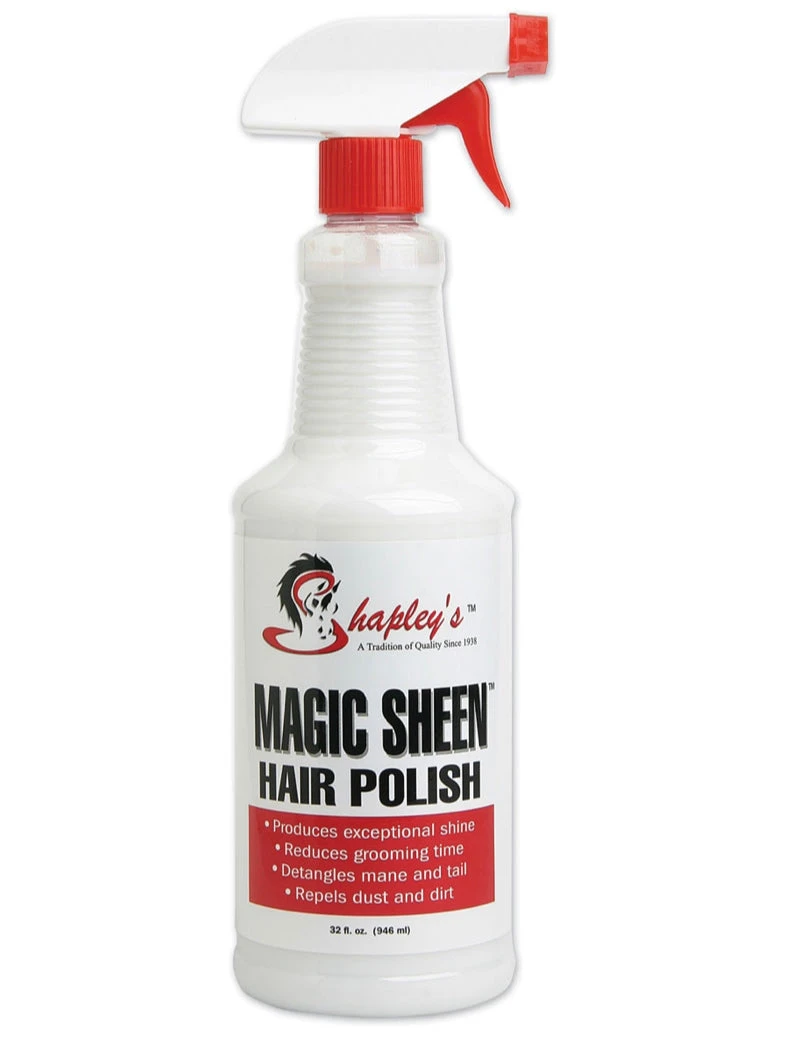 Magic Sheen hair polish is a specially formulated silicone blend that produces maximum shine and a lustrous, healthy coat. Our unique formula can be used on wet or dry hair to easily detangle and condition mane and tail. Magic Sheen will give your horse’s coat the feel of satin and reduce grooming time by coating the hair shaft and repelling dirt and stains.