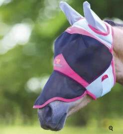 - A structured fly mask that protects the horse from ears to nose