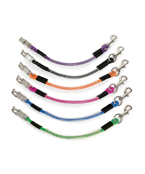 This calming, shock absorbing robust bungee line quickly tethers the horse in the stable, yard or trailer or two can be used to safely cross tie a familiarised horse. If the horse pulls, the bungee line offers gentle resistance which reduces stress. Featuring a swivel trigger clip at one end and a panic release at the other, the polyester bungee is encased in a clear plastic tube to reduce wear and tear.