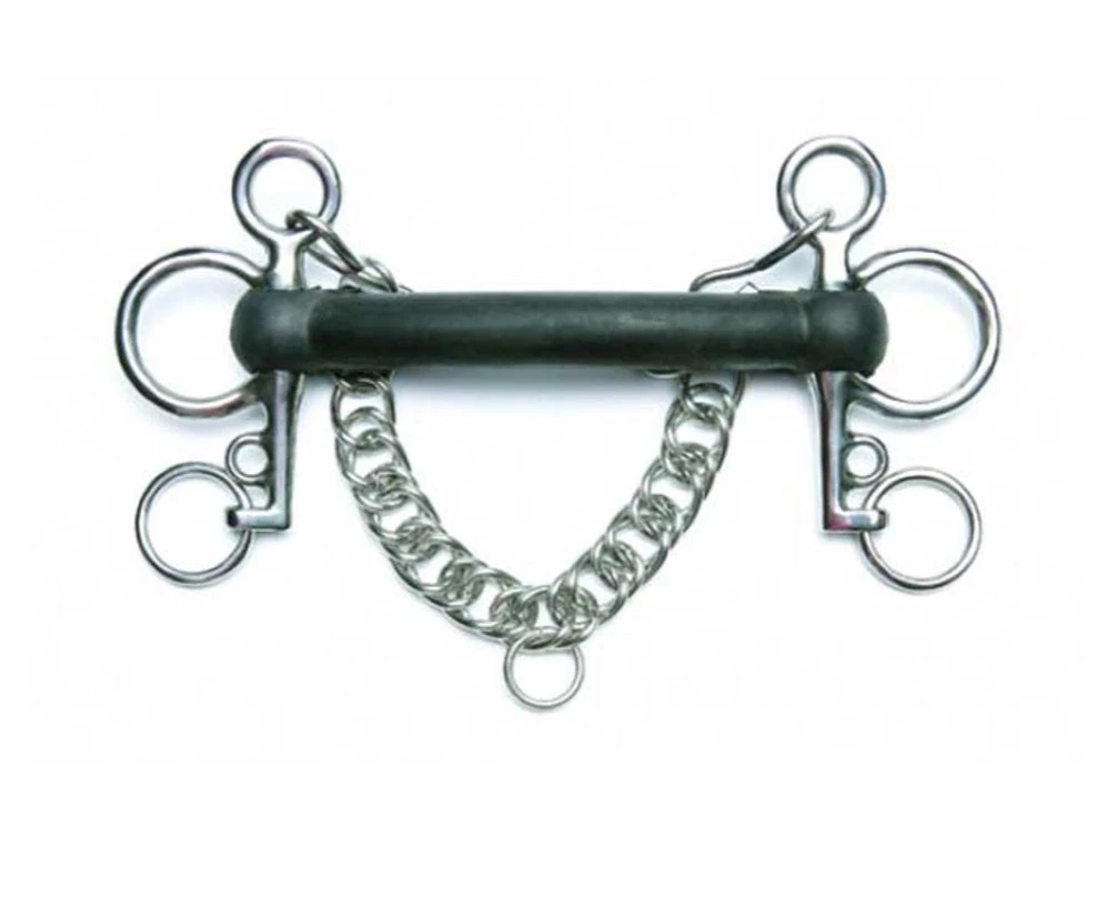 Short shanks. Can be used with double reins or bit converter. Rubber & Stainless Steel.