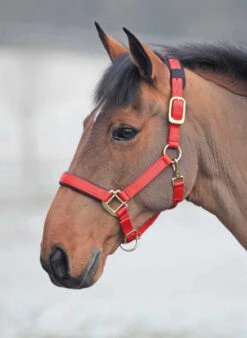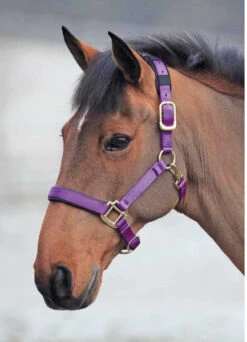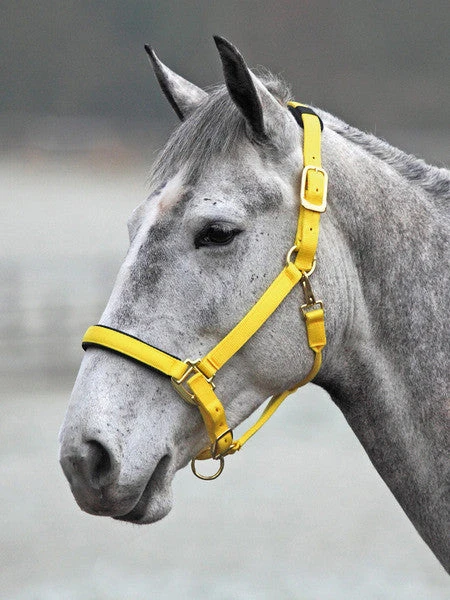 Quality nylon halter with contrast padding, adjustable headpiece with removable padding, breakaway attachment, adjustable nose piece and clip on throat lash.